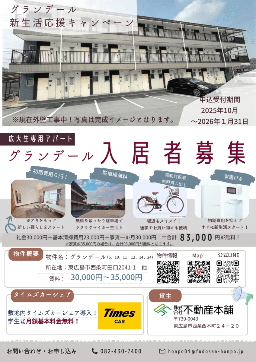 広大生専用アパート「グランデール」で現在お得なキャンペーンを実施しております!