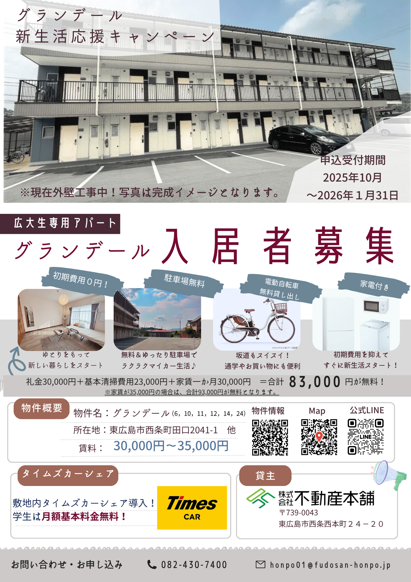 広大生専用アパート≪グランデール≫キャンペーンのお知らせ